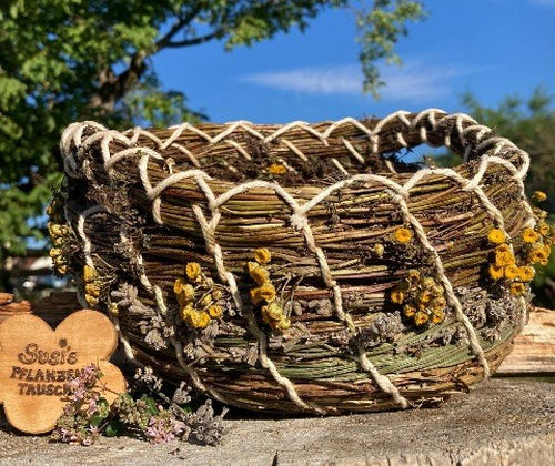Bei diesem Workshop binden wir mithilfe der Spiralwulsttechnik kleine Körbe, etwa in der Größe eines Brot– oder Obstkörbchen (ca. 20-25cm Durchmesser). Wir verwenden dafür langstielige, biegsame Kräuterstängel (z.B. Schafgarbe, Brennessel, Zitronenmelisse, Rainfarn, Dost, Lavendel, Minze etc.) oder Gräser sowie eine Baumwollschnur. Je nach Wunsch können zwei Griffe in den Korbrand eingearbeitet werden.