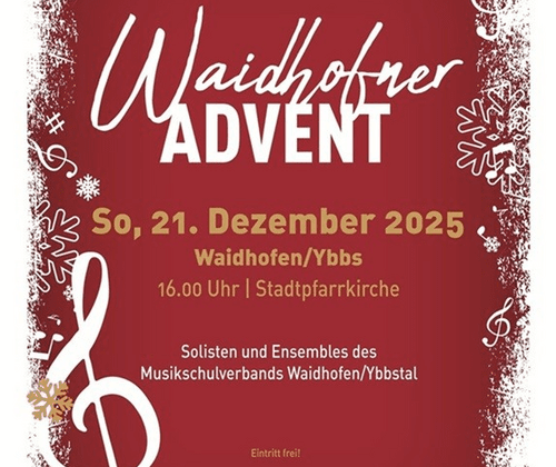 Die Musik- und Kunstschule Waidhofen/Ybbstal freut sich, zum „Waidhofner Advent“, dem traditionellen Weihnachtskonzert in die Stadtpfarrkirche, einzuladen: einem Abend mit besinnlicher Musik ,gestaltet von den Schülerinnen, Schülern und Lehrkräften der Musik- und Kunstschule Waidhofen/Ybbstal. Gönnen Sie sich eine Pause in der vorweihnachtlichen Zeit und genießen Sie die schönen Klänge in der Stadtpfarrkirche/Waidhofen.
