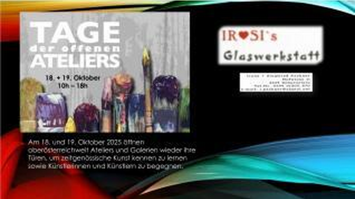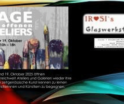 Tage der offenen Ateliers Jedes Jahr öffnen mehr als 300 Ateliers und Galerien ihre Türen im Rahmen der „Tage der offenen Ateliers“. Das Spektrum der zeitgenössischen Kunst kennen zu lernen, Künstlerinnen und Künstlern zu begegnen oder einfach ohne Zeitdruck in Kunstwerke eintauchen - individuell oder geführt, stehen im Mittelpunkt.Glaskunst, Kunsthandwerk, GlasfusingSA + SO 10.00-18.00 Uhr