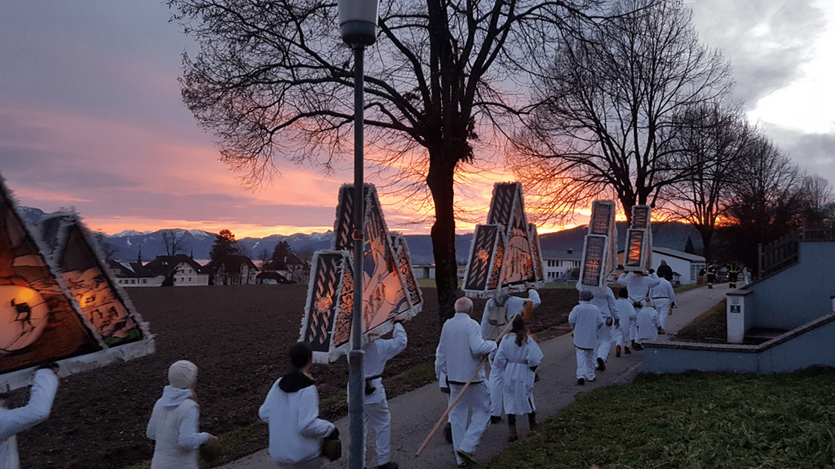 Das Material für diese Kappen besteht hauptsächlich aus Seidenpapier, welches auf kunstvoll gefertigte Holzmodelle aufgeklebt wurde. In der Dunkelheit kommen die verschiedenen Motive der Kappen durch Kerzenlicht im Inneren besonders zur Geltung. Auf Grund dieser Beschaffenheit der Kappen hofft natürlich jeder auf schönes Wetter, denn bei Regen oder Schneefall müßte der Glöcklerlauf abgesagt bzw. verschoben werden.