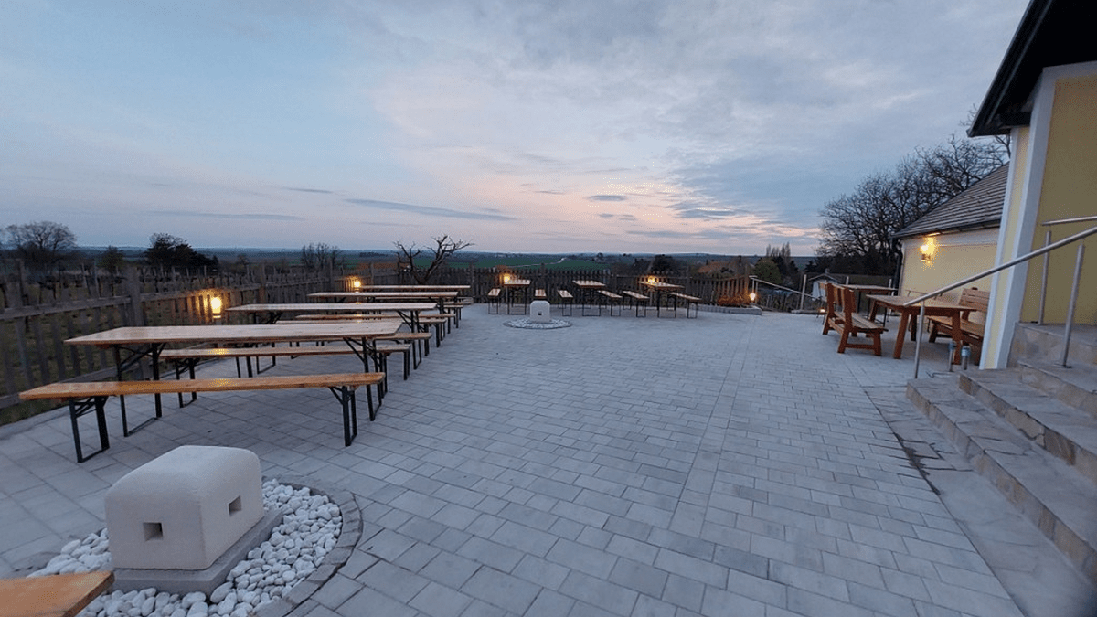 Genießen Sie den herrlichen Ausblick von unserer Kellerterrasse bei der Verkostung unserer Weine und hausgemachten Schmankerln.