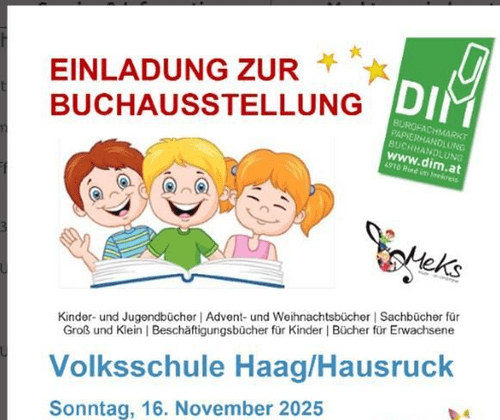 Rahmenprogramm:Beiträge aller Klassen in Kooperation mit der Landesmusikschule Haag/HTombola mit tollen PreisenBuffet (Der Reinerlös kommt den Schülerinnen und Schülern der Volksschule zugute)09:30 Uhr: Eröffnung der Ausstellung und des Buffets11 Uhr: Klassenbeiträge 2., 4A und 4B. Klasseim Anschluss Tombola 1. Ziehung (Preise werden ausgegeben)13 Uhr: Klassenbeiträge 1A, 1B und 3A, 3Bim Anschluss Tombola 2. Ziehung (Preise werden ausgegeben)14 Uhr: Tanzbeitrag Gruppe "Freiraum"15 Uhr: Ende der Veranstaltung