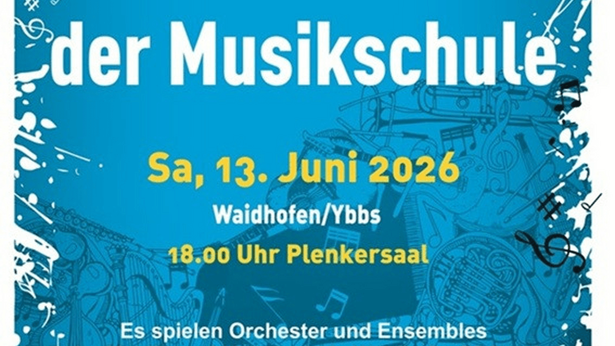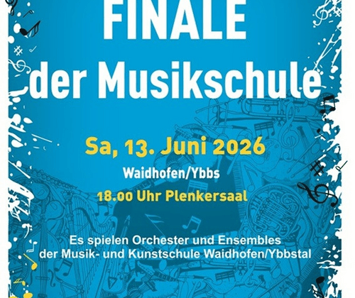 Am Samstag, 13. Juni 2026 findet das Finale der Musikschule um 18 Uhr im Plenkersaal statt. Es treten die verschiedenen Ensembles und Orchester der Musik- und Kunstschule Waidhofen/Ybbstal auf.
