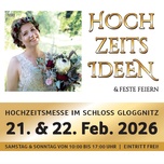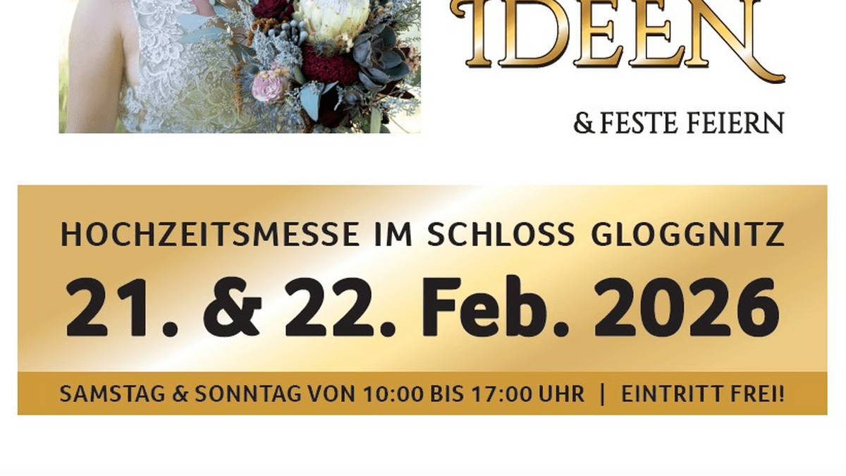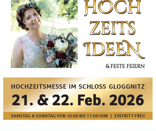 Am 21. & 22. Februar 2026 findet die, inzwischen traditionelle, Hochzeitsausstellung “Hochzeitsideen & Feste feiern” bei freiem Eintritt im Schloss Gloggnitz statt. Im ganzen Schloss präsentieren an diesen 2 Tagen unterschiedliche Dienstleister verschiedenster Hochzeitsbranchen ihre Neuigkeiten und angesagte Trends. Zusätzlich können alle Räumlichkeiten wie das Standesamt, die Kirche, das Schlossrestaurant mit Taverne und der große Festsaal besichtigt werden.
