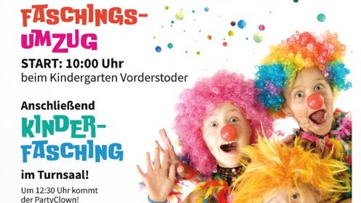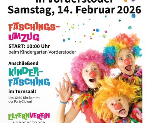 10 Uhr Faschingsumzug mit Start beim Kindergartenanschließend großer Kinderfasching im Turnsaal12:30 Uhr der PartyClown kommt :-)Maskiert euch, schnappt eure Eltern und habt Spaß!