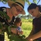 Ich zeige einen Kirschbaum vor dem Weinkeller und wir verlagern die Führung in den Keller.