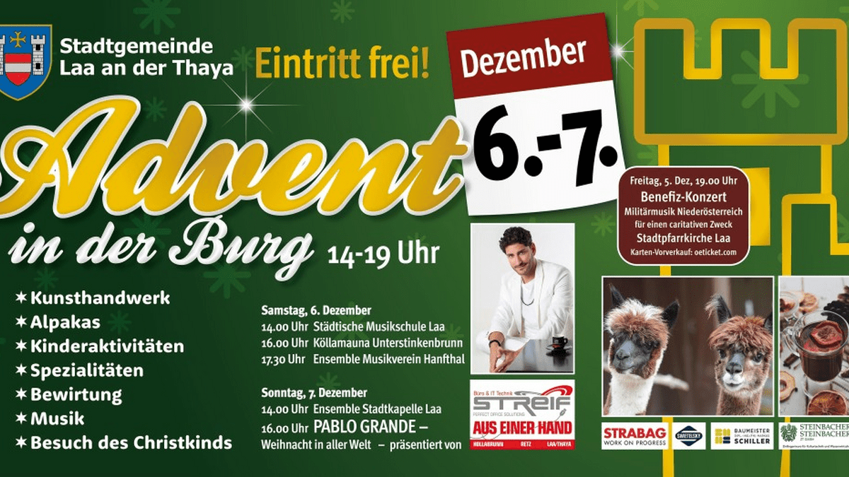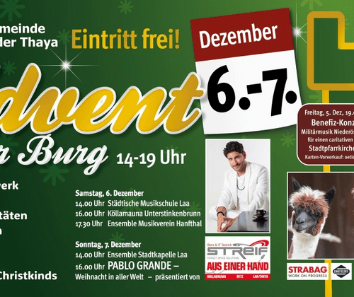 ZUSATZ-TIPP: Bereits am Freitag, 5. Dezember 2025, um 19 Uhr stimmt ein Benefizkonzert der Militärmusik Niederösterreich in der Stadtpfarrkirche Laa auf die Adventtage ein. Der Erlös kommt der Katastrophenhilfe Österreich "Hilfe im eigenen Land" zugute. Karten sind im Vorverkauf über oeticket.com erhältlich.