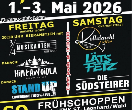 Von 1. bis 3. Mai 2026 lädt die Freiwillige Feuerwehr St. Leonhard am Wald zum traditionellen Zeltfest in die Putzmühle ein. Drei Tage lang sorgen Live-Musik, beste Stimmung und Frühschoppen für Unterhaltung. Für Speis und Trank ist bestens gesorgt – beheiztes Festzelt!
