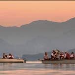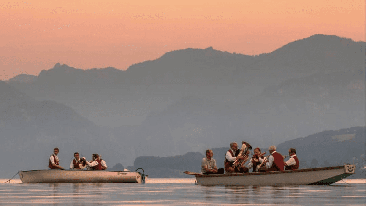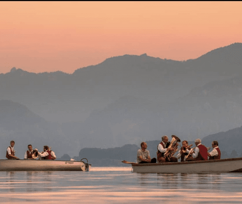 Die Musikkapelle Weyregg veranstaltet ein Seeblasen - eine Gruppe Musikanten fährt im Boot auf dem See und spielt Weisen für die Zuhörer am Ufer - nur bei ruhiger See!
