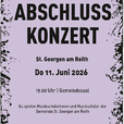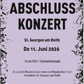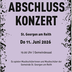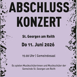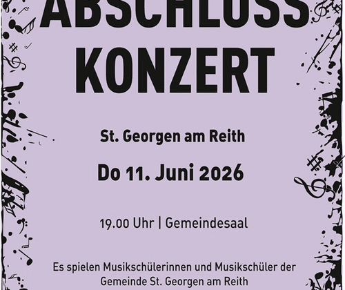 Am Donnerstag, 11. Juni 2026 findet im Gemeindesaal St. Georgen am Reith das Abschlusskonzert der Zweigestelle St. Georgen am Reith der Musik- und Kunstschule Waidhofen/Ybbstal statt. Schülerinnen und Schüler der Gemeinde spielen ein abwechslungsreiches Programm von verschiedenen Solisten, Vocal- und Instrumentalensembles.
