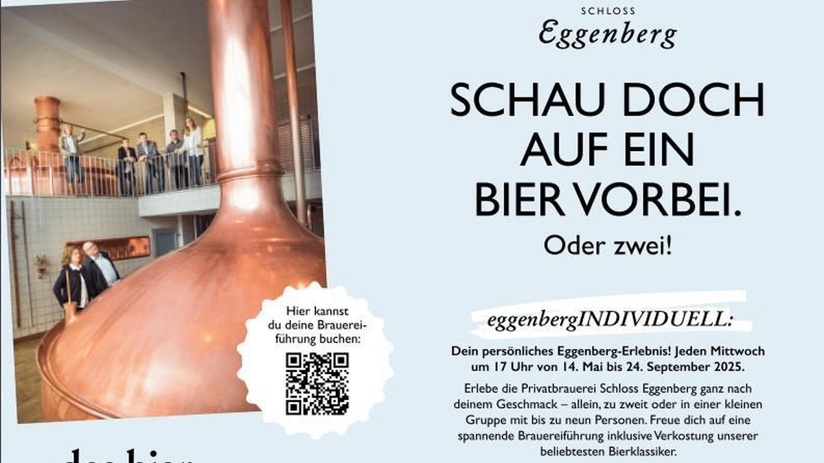 Brauereiführung mit Biersommelièr:e mit anschließender Verkostung von vier klassisch-saisonalen Eggenberger Bieren.Von 13. Mai bis 23. September 2026, jeden Mittwoch um 17:00 Uhr.Dauer: ca. 2 StundenBuchungsmöglichkeiten unter: www.schloss-eggenberg.at oder office@schloss-eggenberg.at