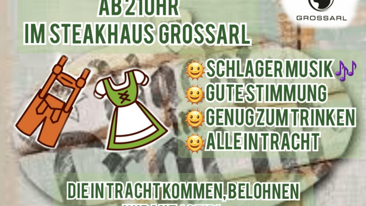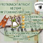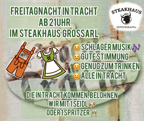 Schlagermusik, gute Stimmung, genug zu Trinken, alle in Tracht - beim Steakhaus Großarl ist jeden Freitag Abend ab 21.00 Uhr Freitagnacht in Tracht. Unsere Gäste erwartet eine gemütliche Atmosphäre mit Fox und Schlagermusik. Die Gäste in Tracht werden mit einem Überraschungsgetränk belohnt.