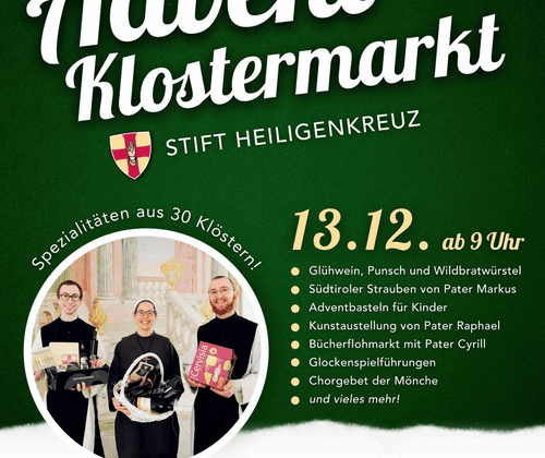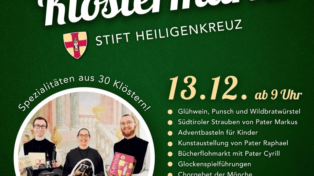 Die besondere Stimmung im Stift Heiligenkreuz lädt zum Genießen der vorweihnachtlichen Zeit ein. Rund 30 Klöster und Ordensgemeinschaften aus Österreich und anderen Ländern bieten ihre Produkte an – von edlen Klosterweinen über Bio-Spezialitäten bis hin zu Kunsthandwerken. Ensembles der Musikkapelle Heiligenkreuz werden auch heuer wieder für eine gemütliche Stimmung sorgen. Während des Klostermarktes sind Sonderführung zum großen Glockenspiel möglich und auch am Chorgebet in der Stiftskirche kann teilgenommen werden. Besucherinnen und Besucher dürfen sich außerdem auf die beliebten Südtiroler Strauben von Pater Markus sowie auf den Bücherflohmarkt mit Pater Cyrill freuen. Für die Kleinsten gibt es das beliebte Advent- und Weihnachtsbasteln am Nachmittag in der großen Aula.
