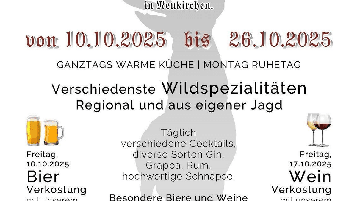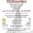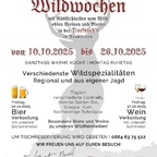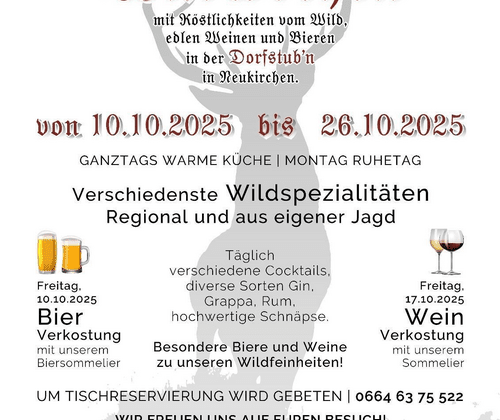 Einladung zu den "Wildwochen" mit Köstlichkeiten vom Wild, edlen Weinen und Bieren in der Dorfstub'n in Neukirchen.