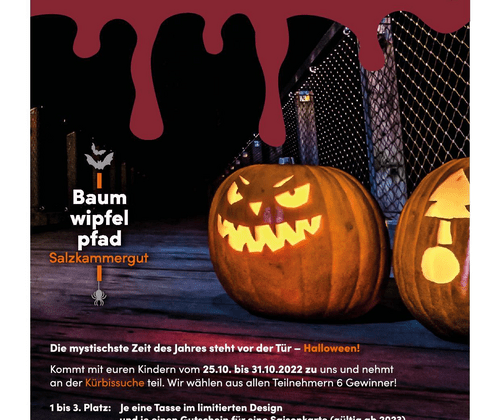 Die mystischte Zeit des Jahres steht vor der Tür - Halloween! Kommt mit euren Kindern vom 28.10.2024 bis zum 31.10.2024 zu uns und nehmt an der Kürbissuche teil. Findet ihr alle Kürbisse, die entlang des Pfads verteilt wurden? Mit etwas Glück könnt ihr diese tollen Preise gewinnen: 3×2 Gutscheine für eine Saisonkarte für den Baumwipfelpfad Salzkammergut 3×1 Merchandise Paket im Wert von 25€ Zusammen mit den inzwischen bunt eingefärbten Blättern wartet am Baumwipfelpfad Salzkammergut eine traumhafte Herbstkulisse auf euch, die zum gemütlichen Waldspaziergang und aufregenden Abenteuern mit der ganzen Familie einlädt. Die Teilnahmekarten liegen am Eingang bereit und können anschließend ausgefüllt in die Los-Box im Baumwipfelpfad-Shop eingeworfen werden. Kasse schließt/letzter Einlass 16:00 Uhr! Anmeldung: nicht erforderlich Eintrittspreis: reguläre Eintritspreise Alle weitern Informationen: www.baumwipfelpfad.at/salzkammergut/