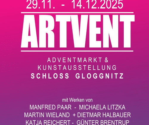 Im Rahmen des Gloggnitzer Schlossadventes präsentieren wir in der Schlossgalerie Gloggnitz die aufregende Künstlerausstellung „ARTVENT“. Diese besondere Veranstaltung bietet den Besuchern die Möglichkeit, die vielfältigen und kreativen Werke der talentierten Künstler zu entdecken.