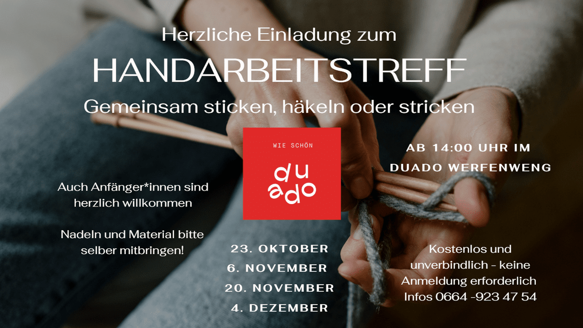 Eintritt: freiwillige Spende Einladung zum Handarbeitstreff, jeweils Donnerstag um 14.00 Uhr Spiele und Plaudernachmittag für Seniorinnen und Senioren, jeden ersten Dienstag im Montat ab 14.30 Uhr Jodeln und zualosn mit Brigitte Lienbacher Die genauen Termine entnehmen sie den Plakaten.