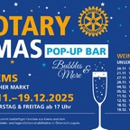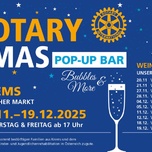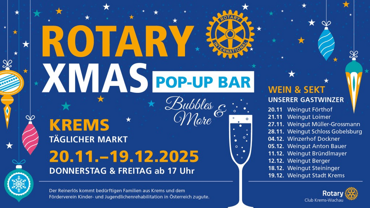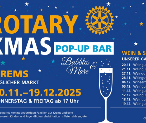 Unter dem Motto "Bubbles & More" öffnet die Rotary Xmas Popup Bar am Täglichen Markt in Krems in der Adventzeit seine Pforten. In der Zeit von 20. November bis 19. Dezember immer Donnerstag & Freitag ab 17 Uhr. Genießen Sie Wein, Sekt, Bier und Flammkuchen. Mit dem Reinerlös wollen wir bedürftige Familien in Krems und den Förderverein "Kinder- und Jugendlichenrehabilitation in Österreich" unterstützen.
