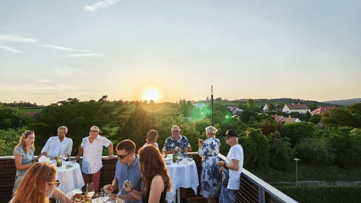 Ein unvergessliches und exklusives Erlebnis rund um den Weinviertler Wein: Weinproben bei traumhaftem Blick auf den Sonnenuntergang mit einem der TOP Winzer des Retzer Landes – mit gemeinsamem Weingartenspaziergang & 6 Weinproben mit 5 gängigem Flying Buffet auf der VinoSPA Terrasse.