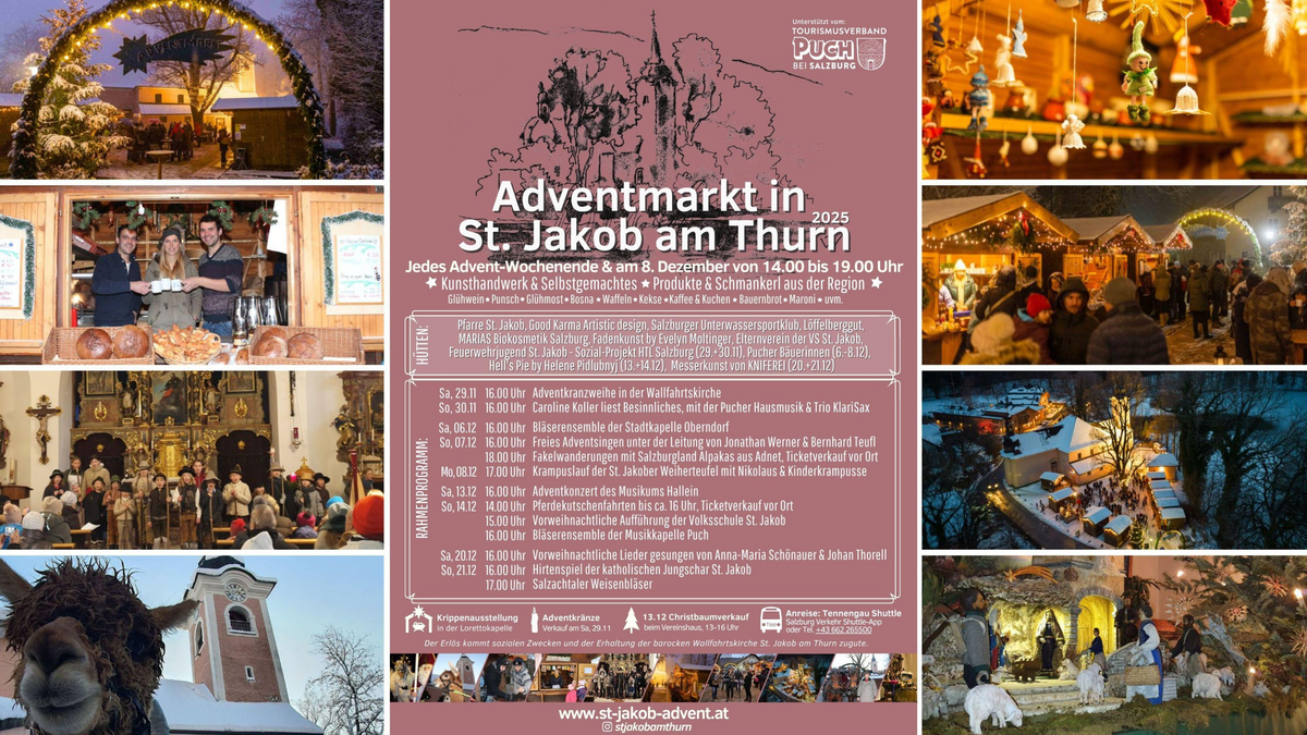 In St. Jakob am Thurn findet jeden Samstag und Sonntag im Advent, sowie am 8. Dezember (Feiertag) von 14.00 bis 19.00 Uhr ein Adventmarkt am Kirchplatz bei der barocken Wallfahrtskirche St. Jakob statt. Die Adventstände bieten Köstlichkeiten wie frisches Bauernbrot, Bosna, Speck, Maroni, süße Waffeln und warme Getränke wie Glühwein und Punsch an. Dazu finden Sie selbstgemachte Handwerkskunst und viele Geschenksideen für Weihnachten. Am Sonntag, 21. Dezember und am Mittwoch, 24.12.2025 präsentiert die katholische Jungschar der Pfarre St. Jakob ein Hirtenspiel in der Wallfahrtskirche St. Jakob. Weitere Informationen zu den Ausstellern und dem wechselnden Programm finden Sie unter: www.st-jakob-advent.at