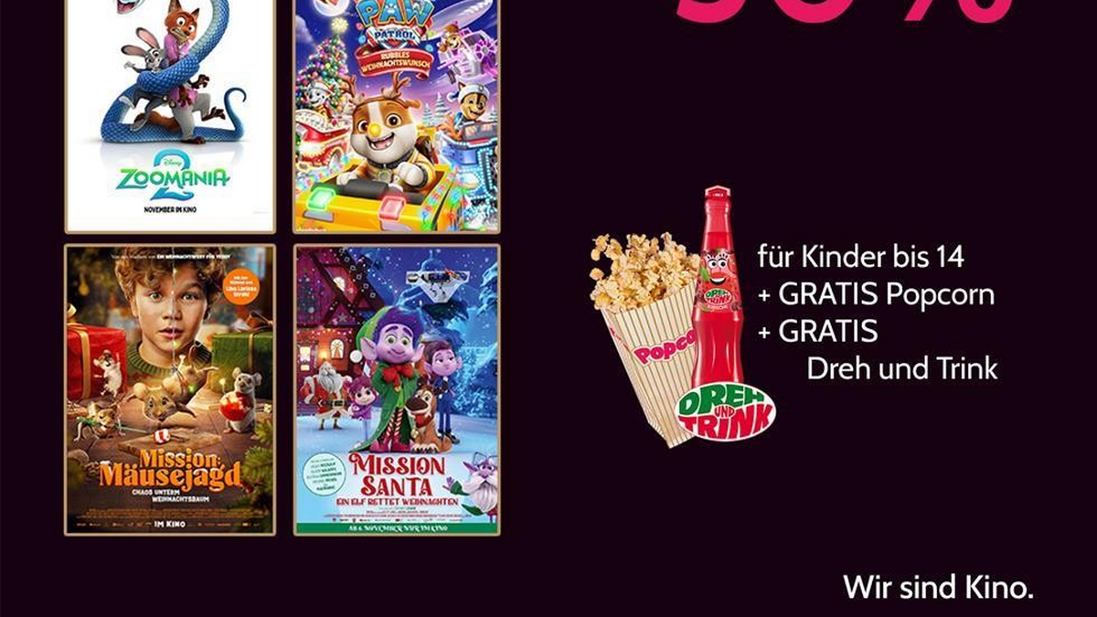 - Gratis Popcorn und "Dreh und Trink" für alle Kinder bis 14 Jahre zum Ticket