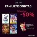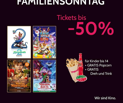 - Der Familiensonntagsrabatt gilt bei ausgewählten Filmen/Vorstellungen bis einschließlich 17:00 Uhr (Sonderscreenings ausgenommen)