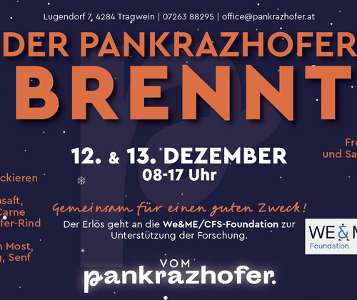 Wenn es beim Pankrazhofer „brennt“, bedeutet das auch heuer wieder Genuss statt Feueralarm: Am Freitag, 12. Dezember, und Samstag, 13. Dezember , jeweils von 8 bis 17 Uhr , werden die sorgfältig eingemaischten „Kronprinz Rudolf“-Äpfel in der traditionellen, holzbefeuerten Wasserbad-Brennerei destilliert – und alle, die möchten, können live dabei sein und beim gemütlichen Tarockieren mitmachen, plaudern, verkosten und unser hausgemachtes Chili Con Carne genießen. Freitagnachmittag und Samstagvormittag wird das Erlebnis zusätzlich durch besinnliche Harfenklänge untermalt. Verkostung aller Produkte Besucher:innen erhalten ein Glas und einen Verkostungslöffel und können damit das gesamte Sortiment durchkosten: von Most, Saft und Prickelnd über Leinöl, Senf bis hin zu zehn Essigsorten. Mittlerweile sind es bereits über 60 hausgemachte Spezialitäten, die Eva und Norbert entwickelt haben. Die freiwilligen Spenden unterstützen die We&ME/CFS-Foundation, die sich für mehr Forschung und ein besseres Verständnis der Erkrankung ME/CFS einsetzt.