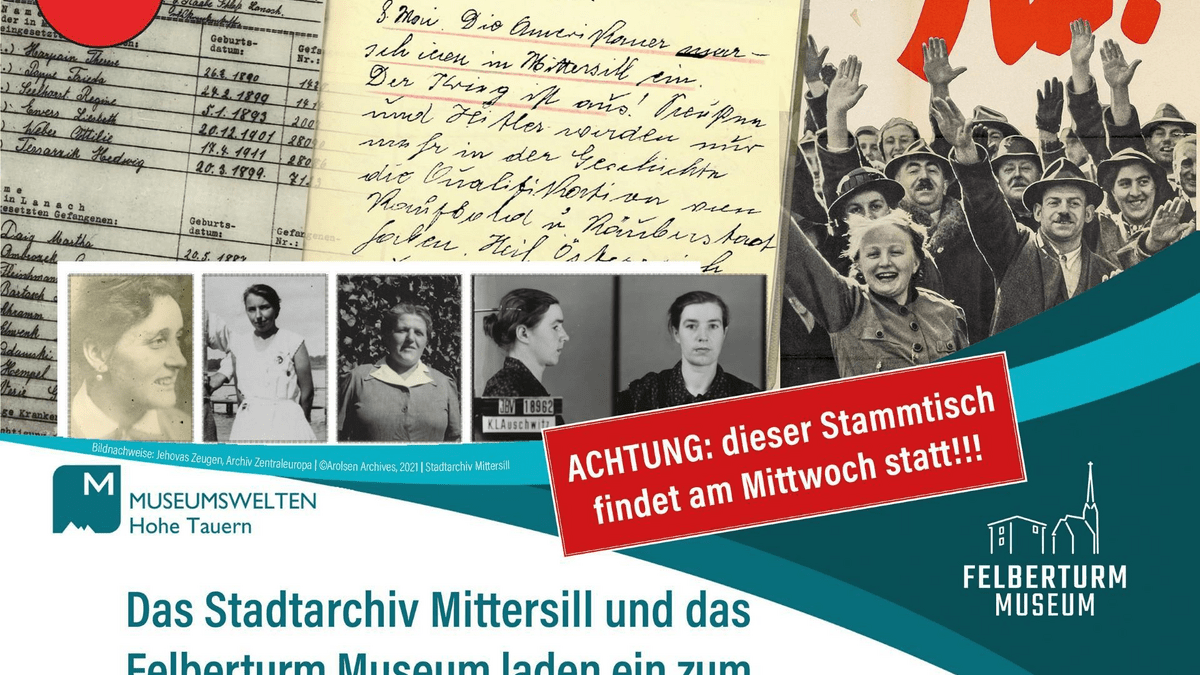 Achtung! Dieser Stammtisch findet am Mittwoch, 03. Dezember 2025 statt! | 19:00 Uhr | Felberturm Museum"Ein sensibler Blick zurück" - Zeitgeschichte | Mittersill 1938 - 1945Museumskoordinatorin Manuela Goffitzer führt durch die Sonderausstellung, die noch bis Ende März 2026 zu sehen ist. Neben der Führung gibt es Zeit für Gespräche und Diskussionen.