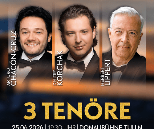 Nach dem großen Erfolg 2025 kehrt die Opern-Open-Air-Gala 2026 an die Donaubühne Tulln zurück: Am 25. Juni 2026 wird das Donauufer erneut zur Bühne für einen Abend voller Klangpracht, Leidenschaft und großer Stimmen. Mit Arturo Chacón-Cruz, Dmitry Korchak und dem österreichischen Grammy-Gewinner Kammersänger Herbert Lippert vereint sich ein herausragendes Tenortrio zu einem Konzert, das Herz und Seele berührt – getragen von jener Strahlkraft, die die Oper und die großen Songs seit jeher unsterblich macht.