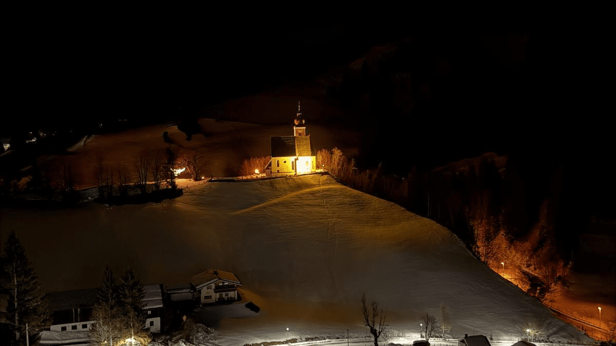 Unter dem funkelnden Sternenhimmel genießt du den atemberaubenden Blick auf die Kirche und den majestätischen Hochkönig. Bei einem wärmenden Getränk auf der Alm kannst du die ruhige, winterliche Atmosphäre genießen.