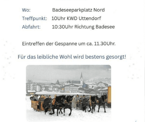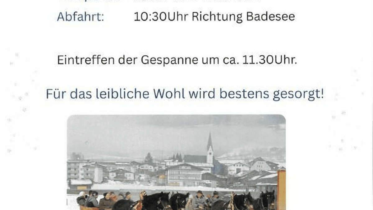 Einladung zur Sternfahrt in UttendorfAm Sonntag, den 18. Jänner 2026 findet ab 10:00 Uhr die Sternfahrt statt.Treffpunkt: Gespanne um 10:00 Uhr bei der KWD UttendorfEintreffen der Gespanne beim Badeseeparkplatz Nord um ca. 11:30 UhrFür das leibliche Wohl ist bestens gesorgt.Auf zahlreiche Rosserer und Pferdeliebhaber freuen sich der Pferdezuchtverein P2, die Reitergruppe Uttendorf, die Landjugend und die Bäuerinnen.Für Unfälle wird keine Haftung übernommen!Bei Fragen unter +43 664/968 74 12 melden.