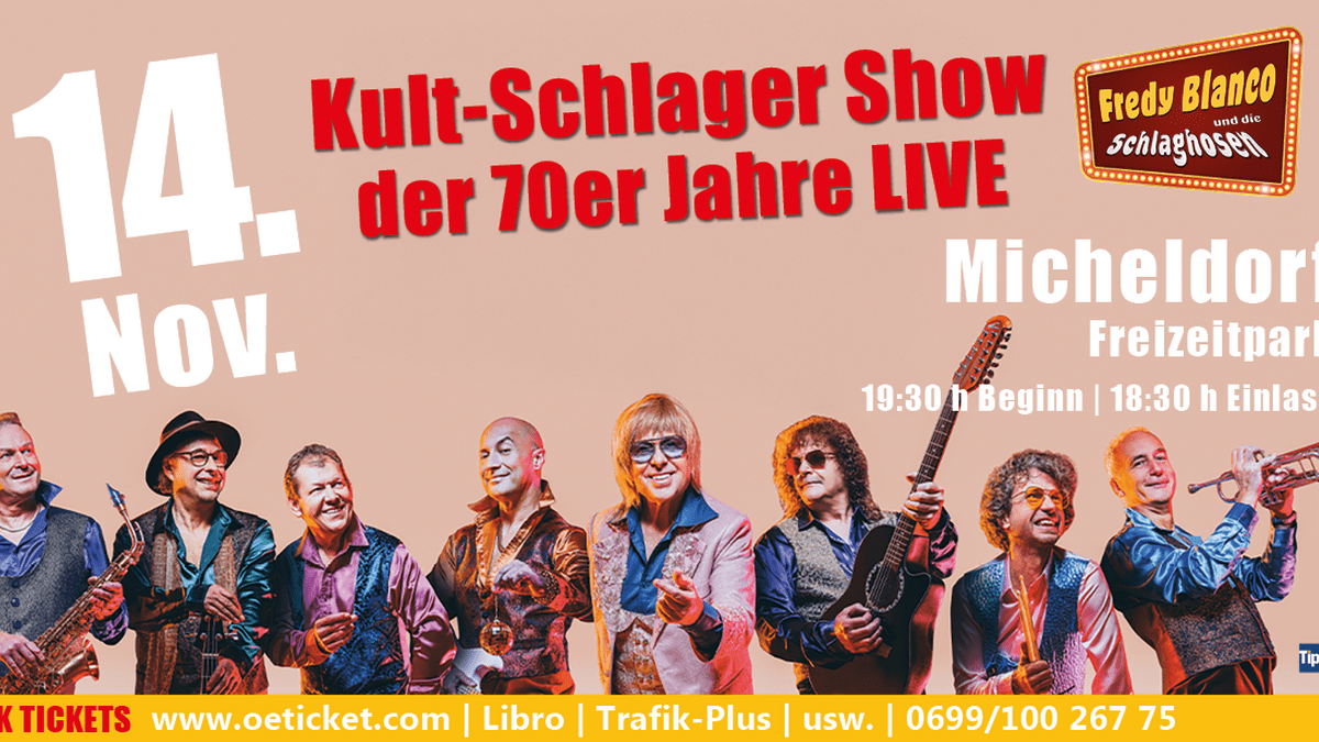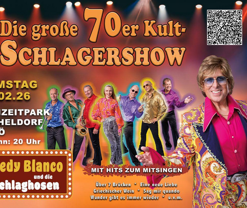 Die große 70er-Jahre-Kult-Schlagershow. Bereit für eine musikalische Zeitreise? Fredy Blanco und die Schlaghosen bringen die Hits der 70er Jahre mit einer explosiven Mischung aus Energie und Nostalgie zurück auf die Bühne.