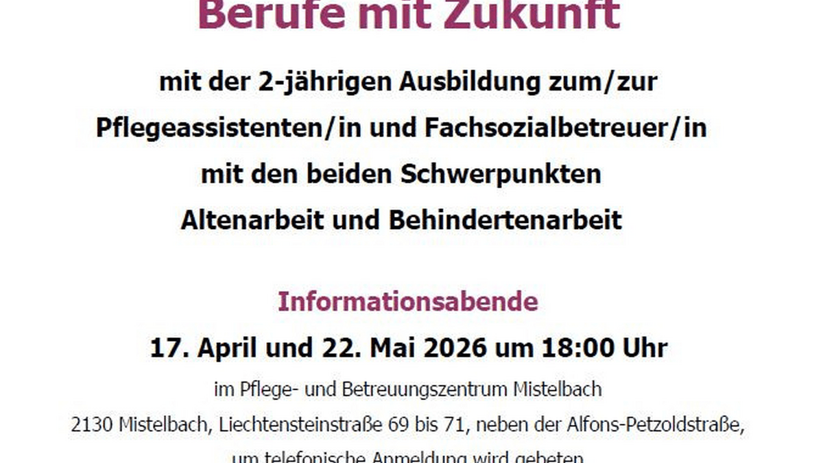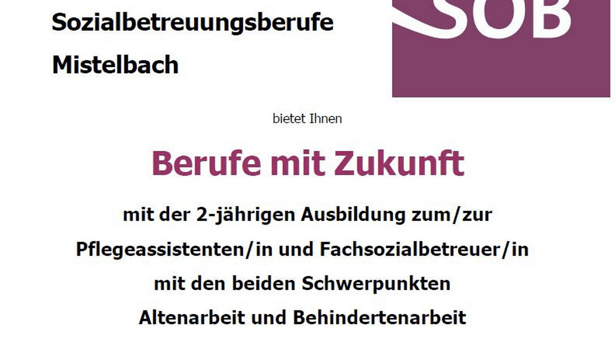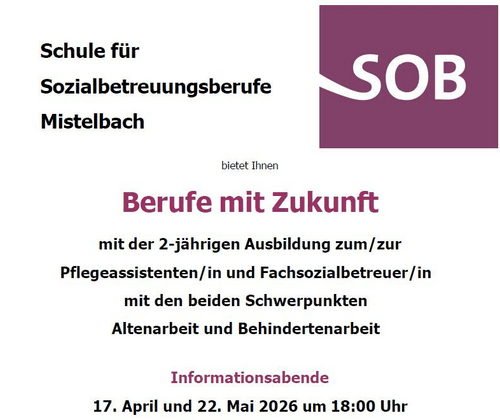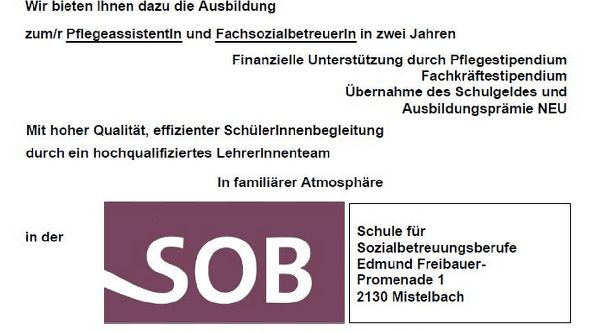 Die Schule für Sozialbetreuungsberufe (SOB) des Vereins zur Errichtung und Erhaltung einer Schule für Sozialbetreuungsberufe Mistelbach lädt alle Interessierten zu einem Infoabend ein.
