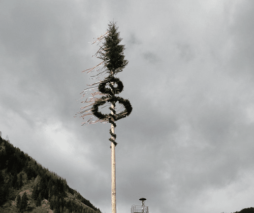 Der Maibaum ist ein Symbol für Fruchtbarkeit, Leben und Blühen der Natur. Das Maibaumaufstellen ist vielerorts äußerst beliebt - ein Brauchtum mit einer langen Tradition. Meist wird dafür eine bis zu 35 Meter lange Fichte verwendet. Zunächst wird diese "geschäpst" (von Rinden und Ästen befreit), später mit Bändern und selbst geflochtenen Kränzen geschmückt. An der Spitze des Baumes bleibt der grüne Wipfel erhalten.
