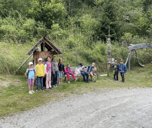 Heute machen wir uns mit dem Bus auf den Weg zum Waldlehrpfad nach Zederhaus. Danach suchen wir Schätze im Wald & gestalten großartige Sachen damit.