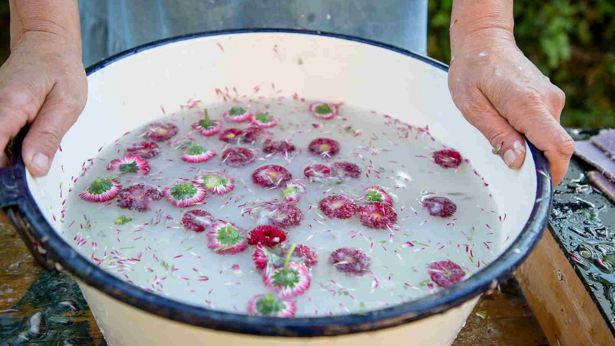 Es werden Kräuter, frische Blüten, Blätter in den Papierzellstoff eingearbeitet.