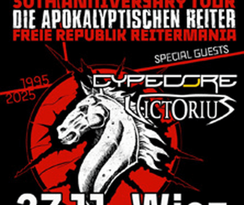 Nun bringen die Reiter dieses Feuer endlich wieder auf die Bühne! Die große 30 JAHRE ANNIVERSARY TOUR führt durch Deutschland, Österreich und die Schweiz - eine Reise, die Fans und Band gemeinsam in der grenzenlosen Republik Reitermania vereint. Mit einer mitreißenden Setlist, die Klassiker, Kultsongs und neue Hymnen vereint, versprechen Die Apokalyptischen Reiter eine Show, die Generationen verbindet - alte Weggefährten und neue Anhänger gleichermaßen. Magische Momente, bei denen Fans in Erinnerungen schwelgen und Neuentdecker die ungebändigte Energie der Reiter zum ersten Mal hautnah spüren. Vergangenheit und Zukunft verschmelzen in einer Show voller Leidenschaft, Musik und Reitermania!