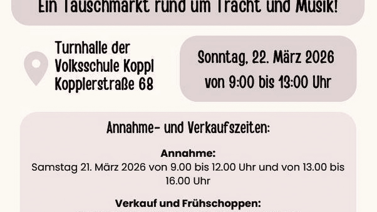 Bringt die Sachen unetekettiert zur Annahme-das übernehmen wir, ihr bestimmt den Preis. Pro Artikel werden € 0,50 für die Verwaltung eingehoben und 15% Ihres Verkaufserlöses kommt der TMK Koppl zugute. Maximal 35 Stück. Annahme: Samstag, 21. März 2026 von 09:00 bis 12:00 Uhr und von 13:00 bis 16:00 Uhr