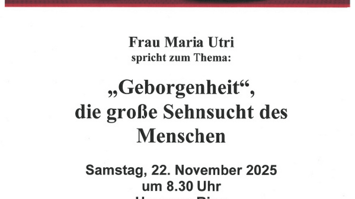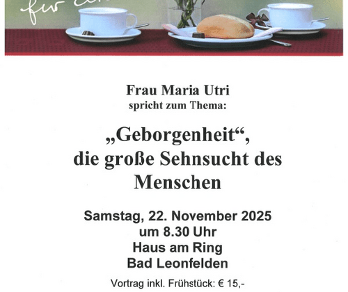 Mehr als ein Frühstück! Frau Maria Utri spricht zum Thema: "Geborgenheit", die große Sehnsucht des Menschen Samstag, 22. November 2025 um 8.30 Uhr, Haus am Ring Bad Leonfelden Vortrag inkl. Frühstück: €15,- Anmeldung und Information unter 0676/5182678 oder ff.treffen.badleonfelden@gmail.com www.fruehstuecks-treffen.at