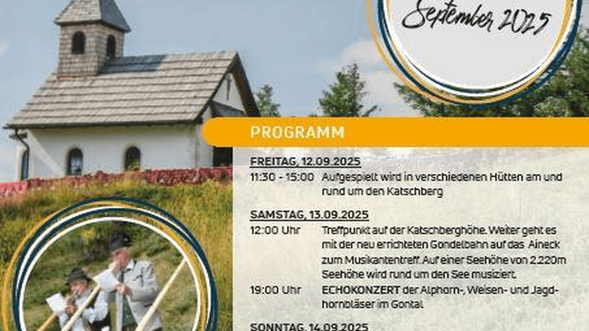 Gestartet wird am 11. September in verschiedenen Hütten am und rund um den Katschberg. Alphorn-, Weisen- und Jagdhornbläser treffen zusammen und es wird lustig aufgespielt. Weiter geht es am 12.09. mit dem Musikantenwandertag. Mit der neuen Gondelbahn geht es auf das Aineck, wo in luftiger Höhe, auf 2220m Seehöhe, rund um den See musiziert wird. Das Highlight: ab 19:00 Uhr wird zu einem ECHO-KONZERT im Gontal geladen.