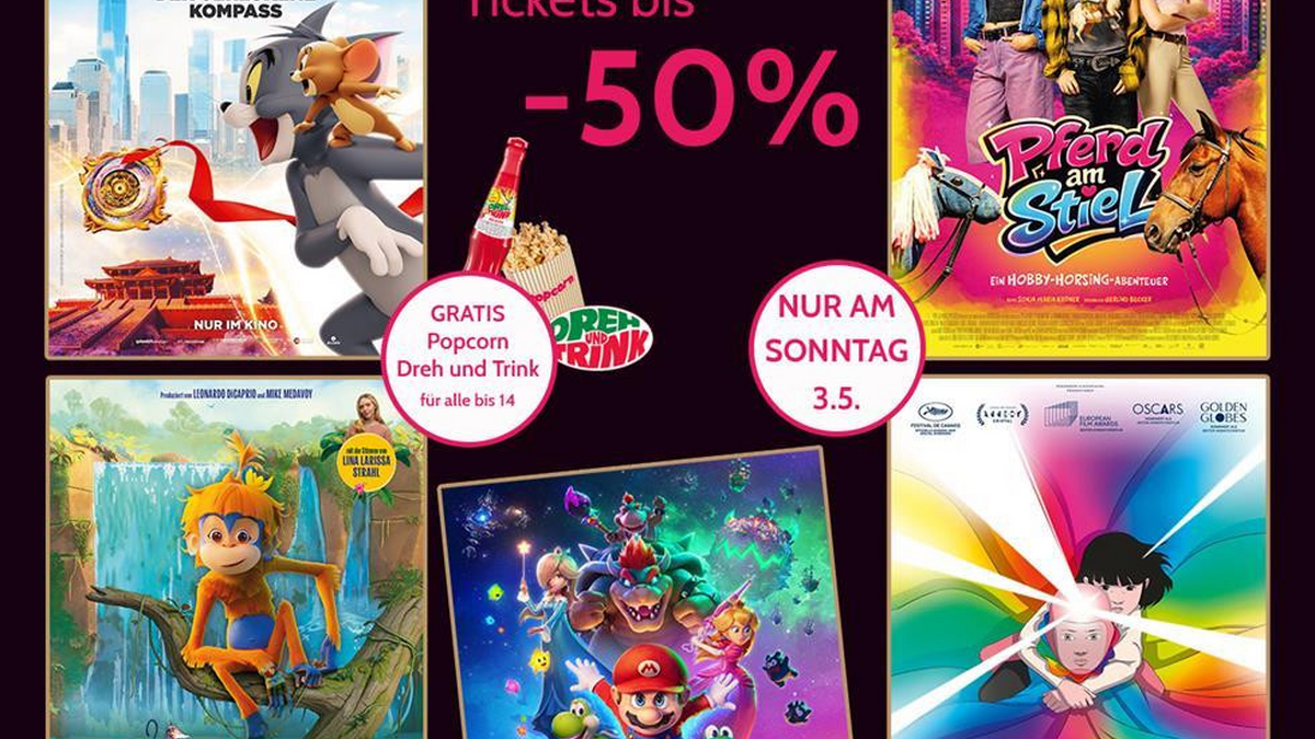 - Gratis Popcorn und "Dreh und Trink" für alle Kinder bis 14 Jahre zum Ticket