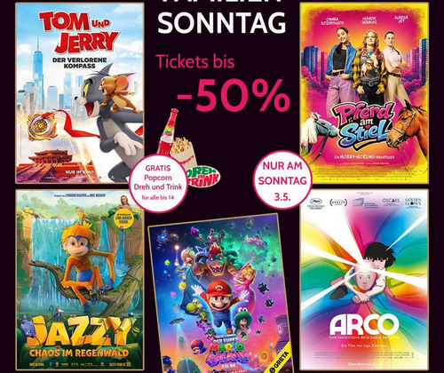 - Der Familiensonntagsrabatt gilt bei ausgewählten Filmen/Vorstellungen bis einschließlich 17:00 Uhr (Sonderscreenings ausgenommen)