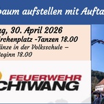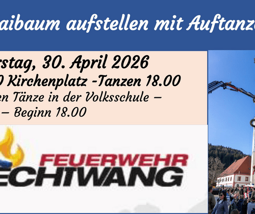 Sei dabei, wenn in Viechtwang der Maibaum aufgestellt wird!ab 16:30 Uhr: Gerstl Musiab 18:00 Uhr: Volkstanzen: Auftanz der SchülerInnen der Volksschule Viechtwang, der Landjugend Viechtwang und der Tanzgruppe Treffpunkt Tanz(Bei Regen findet das Auftanzen in der Volksschule statt)Anschließend Maibaumübergabe an Familie Silmbroth. Ausklang mit der Gerstl Musi.