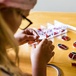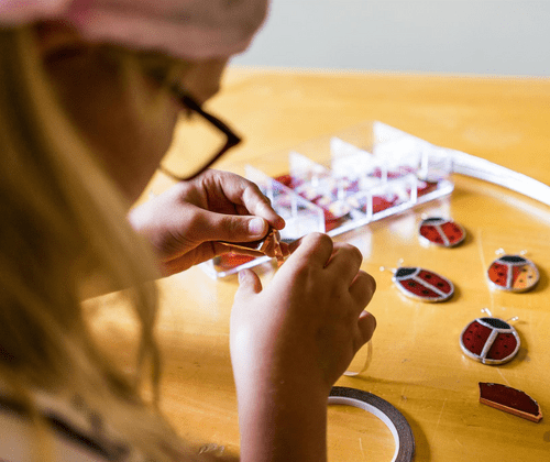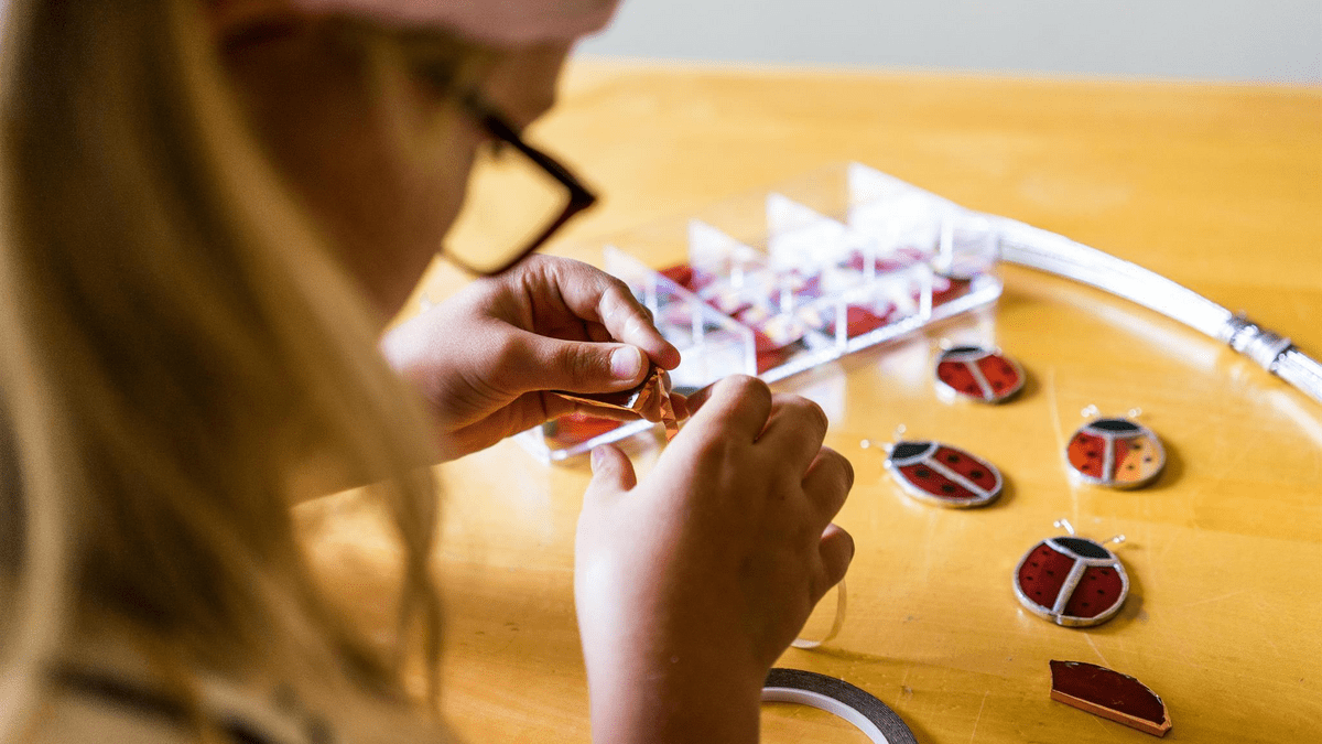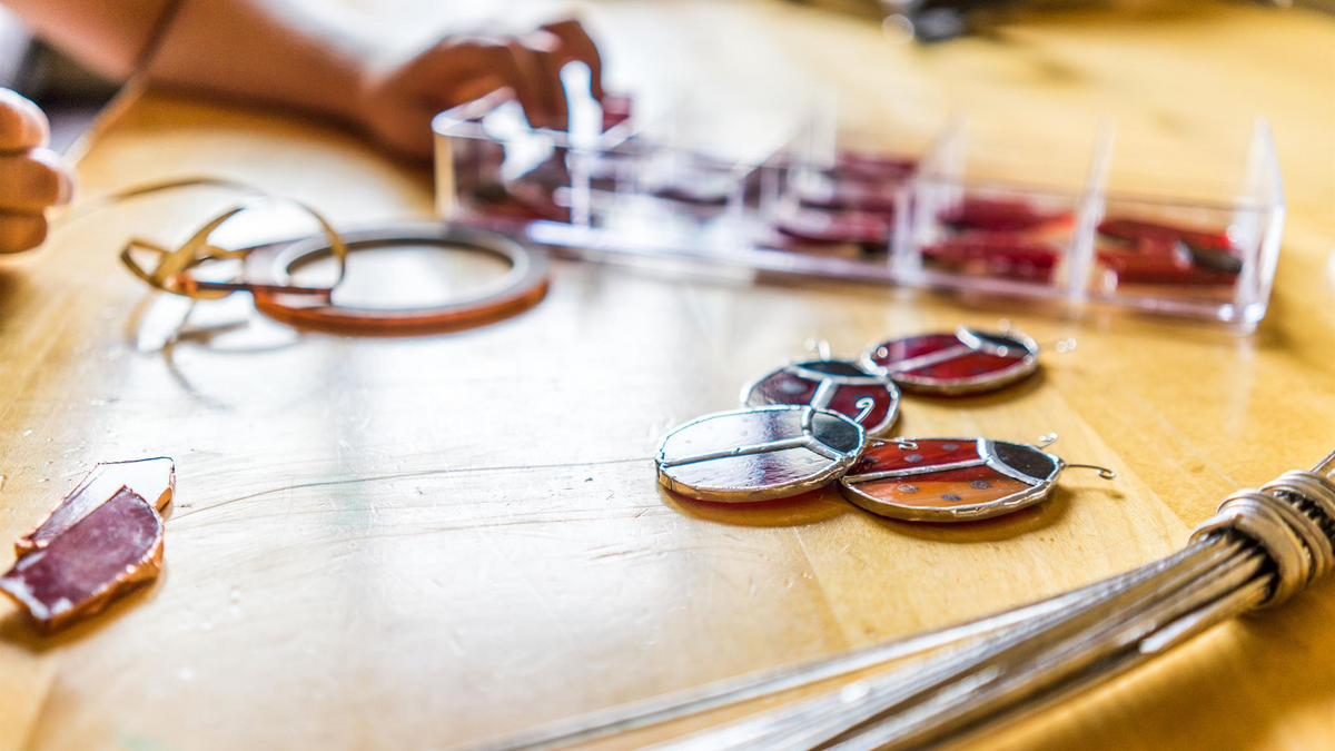 Bunte Glasteile werden zuerst behutsam geschliffen und in die gewünschte Form gebracht. Durch Löten werden die Glassplitter miteinander verbunden und ein kleines Glaskunstwerk entsteht.