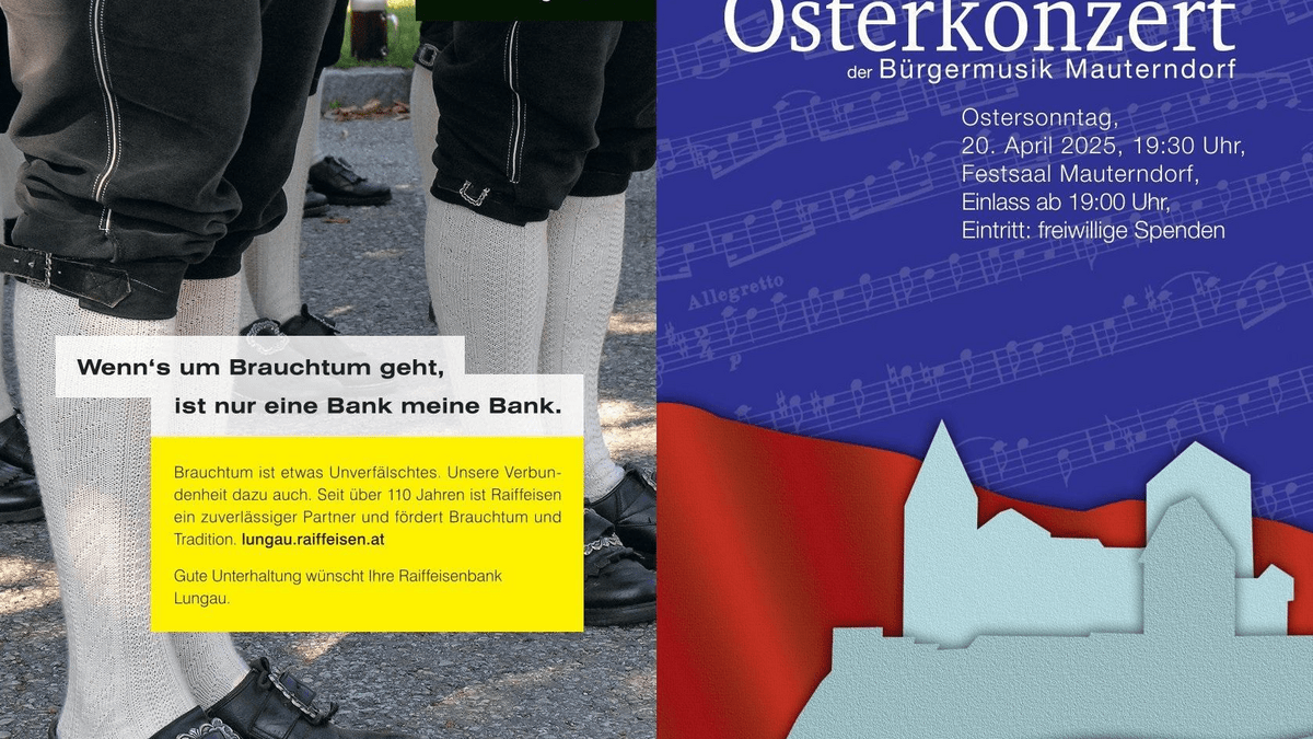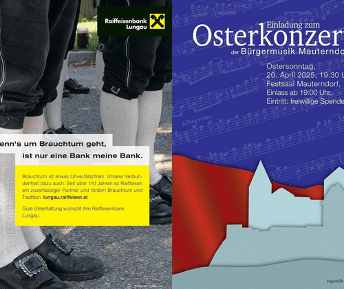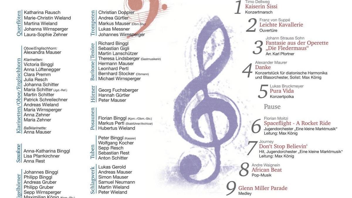 Veranstaltungsort: Festsaal, MauterndorfEintritt: freiwillige SpendenDurch das Programm führt Gerhard Mauser1. Timo Dellweg Kaiserin Sissi Konzertmarksch2. Franz von Suppé Leichte Kavallerie Ouvertüre3. Johann Strauss Sohn Fantasie aus der Operette "Die Fledermaus" Arr. Karl Pfortner4. Alexander Maurer Danke Konzertstück für diatonische Harmonika und Blasorchester, Solist: Max König5. Lukas Bruckmeyer Pura Vida KonzertpolkaPAUSE6. Florian Moitzi Spaceflight - A Rocket Ride ugendorchester" Eine kleine Marktmusik" Leitung: Max König7. Journey Don't Stop Believin"Hit, Jugendblasorchester "Eine kleine Marktmusik" Leitung: Max König8. Andre Waignein African Beat Pop-Musik9. Glenn Miller Parade Medley10. Michael Gleisler On Fire Konzertstück