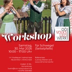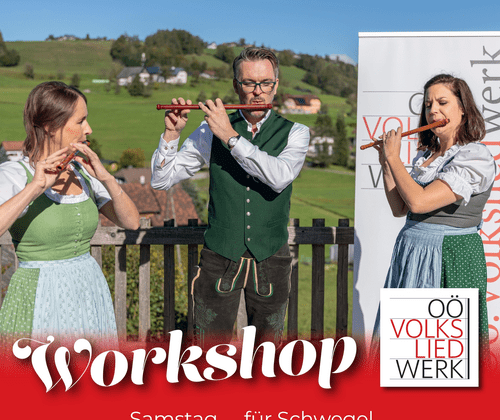 Workshop für Schwegel im Viechtauer Heimathaus in Neukirchen bei Altmünster am Samstag, 30. Mai 2026 von 10:00 Uhr - 17:00 UhrReferenten: Leopold Schiendorfer & Ludwig WienerUnser Schwegel-Workshop ist für leicht Fortgeschrittene ebenso geeignet wie für erfahrene Seitelpfeifer.Grundkenntnisse: Tonerzeugung am Instrument und Tonleiter sind erforderlichKosten 59,00 Euro pro PersonMitglieder im OÖ Volksliedwerk erhalten 10% Rabatt auf den KursbeitragAnmeldeschluss: 25. Mai 2026
