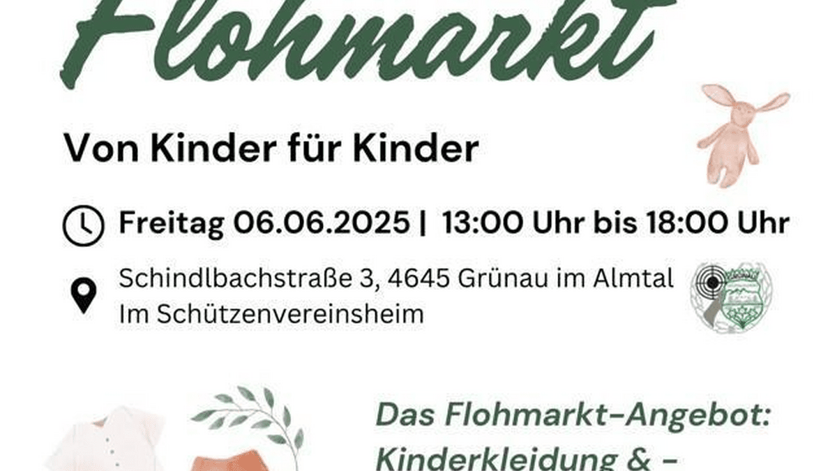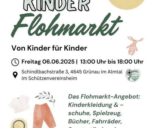 Kinder Flohmarkt am Freitag, 24.10.2025 von 13:00 bis 18:00 Uhr im Schützenvereinsheim in Grünau. Von Kinder für Kinder! Das Flohmarkt-Angebot: Kinderkleidung und -schuhe, Spielzeug, Bücher, Fahrräder, Sportartikel und viele weiter Schätze. Standgebühr: € 10,- Anmeldungen bis 21.10.2025 unter: 0677 62680584 oder irenemaier@gmx.at Die Kinder freuen sich auf zahlreiche Besucher!