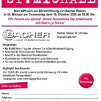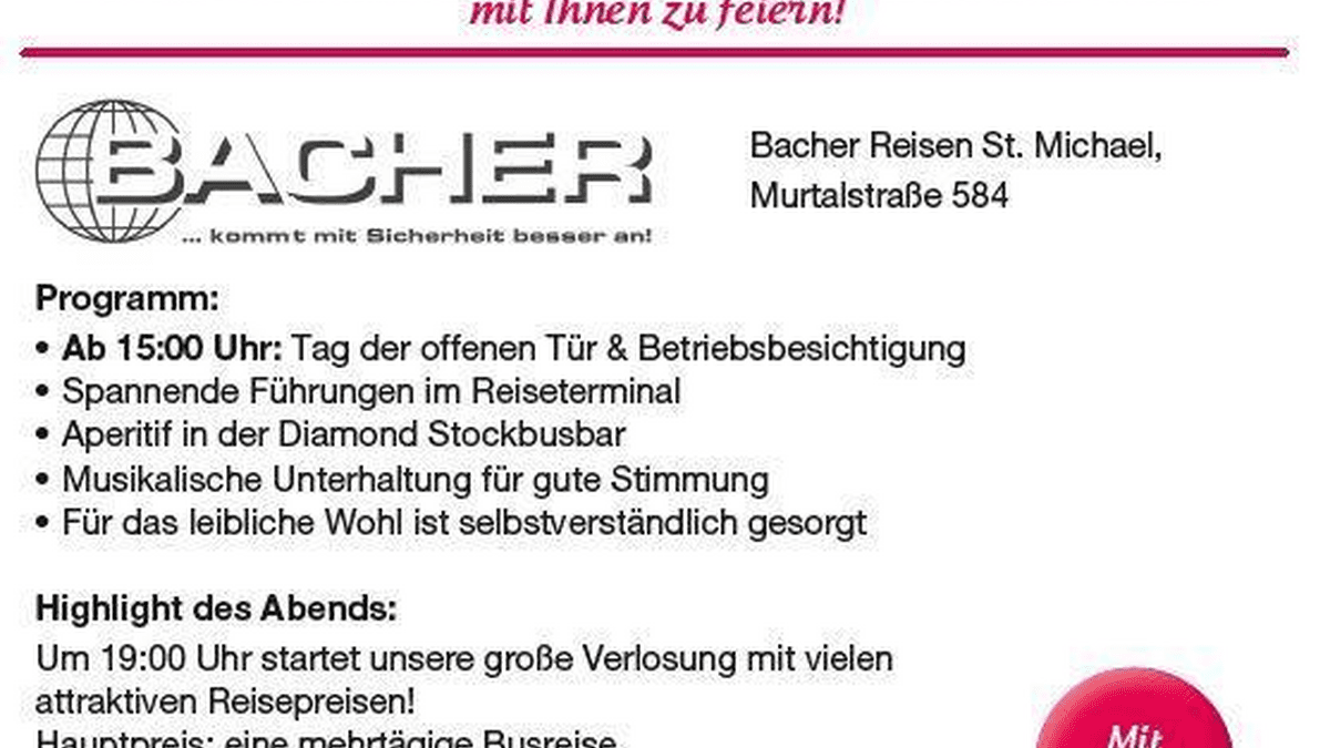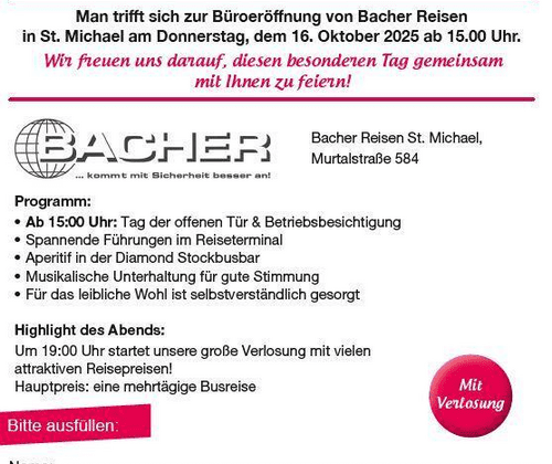 Man trifft sich zur Büroeröffnung von Bacher Reisen in St. Michael am Donnerstag, 16. Oktober 2025 ab 15:00 Uhr. Programm: Ab 15:00 Uhr: Tag der offenen Tür & Betriebsbesichtigung Spannende Führungen im Reiseterminal Aperitif in der Diamond Stockbusbar Musikalische Unterhaltung für gute Stimmung Für das leibliche Wohl ist selbstverständlich gesorgt Highlight des Abends: Um 19:00 Uhr startet die große Verlosung mit vielen attraktiven Reisepreisen! Hauptpreis: eine mehrtägige Busreise