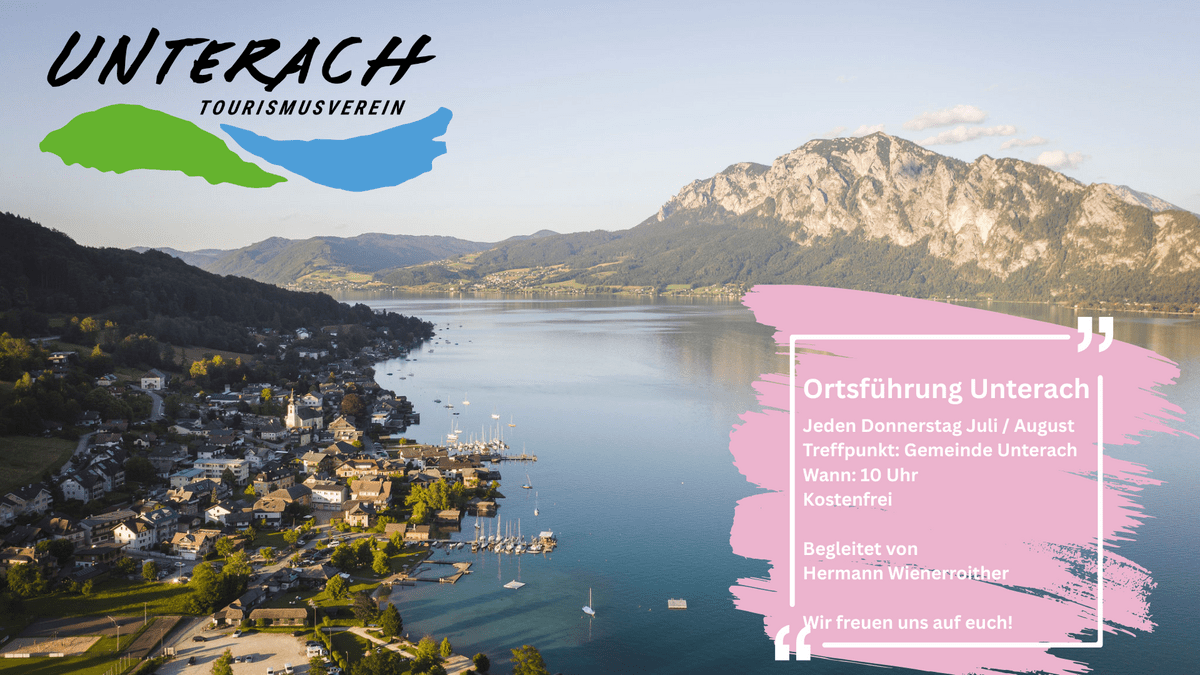 Erfahren Sie mehr über Unterach am Attersee im Salzkammergut!Begleitet von Hermann Wienerroither erfahren Sie, warum Unterach in der Vergangenheit und auch heute noch "Klein Venedig" genannt wird, oder was es mit dem berühmten "Schlackenberg" auf sich hat. Lernen Sie den Ort zwischen Attersee und Mondsee von einer neuen Seite kennen und tauchen Sie ein, in die Geschichte und Besonderheiten des Ortes. Die Führung durch Unterach am Attersee ist kostenlos und findet im Juli und August, jeden Donnerstag, um 10:00 Uhr statt.