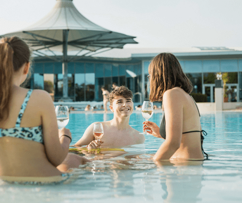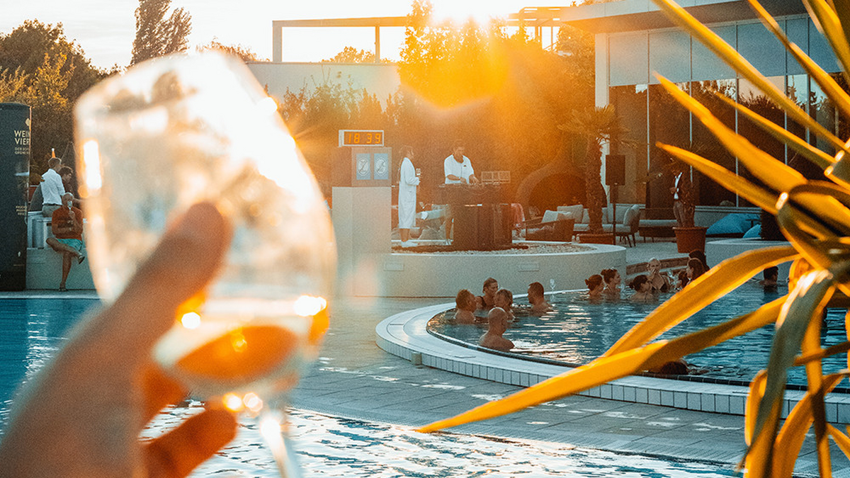 Die Arbeitswoche ganz entspannt ausklingen lassen? Am besten mit dem beliebten After-Work Event „Pool & Wine“ in der Therme Laa. Relaxen im Solebecken, stimmungsvolle DJ-Beats, regionaler Genuss mit Weinviertler Weinen und Köstlichkeiten vom Foodtrailer sorgen für ein ganz besonderes Ambiente.